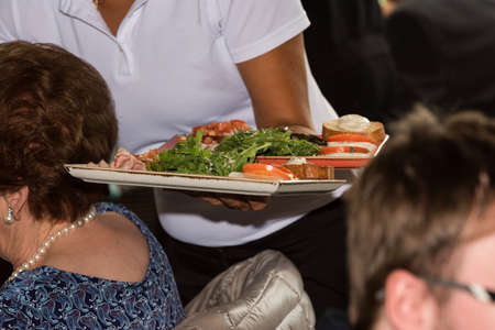 Waiter carrying plates with appetizers on some festive event, party or wedding