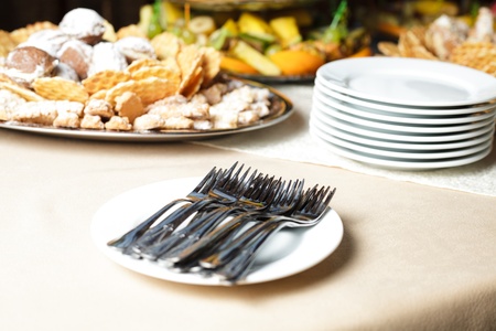 Pile of white plates, cutlery and paper glasses on the cocktail table at a party.
