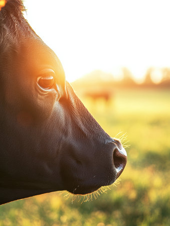 Soft fur textures and a gentle gaze characterize this cows face, with warm sunlight enhancing the peaceful rural atmosphere of the farm.