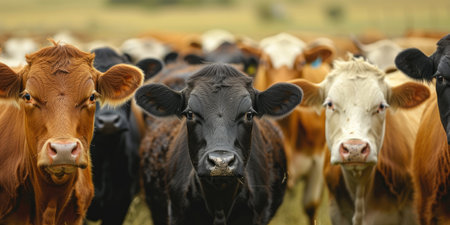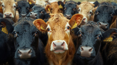 A mixed herd of cows gathers in an open field under clear skies. The foreground features a distinct orange cow among predominantly black ones, highlighting the diversity of the group.