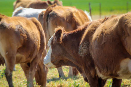 Close up of cows in a field, grazing on pasture, in Australia