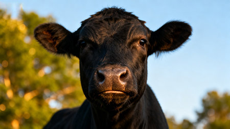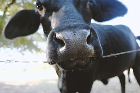 Cute black angus heifer closeup looking at camera with big nose on cattle farm.