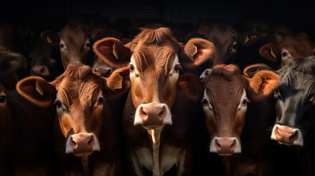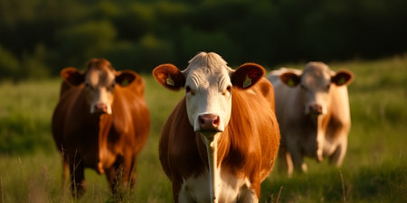 Herd of cows on the meadow at sunset. selective focus. Generative AI