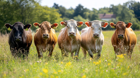 A group of five cows stands closely together in a lush green meadow dotted with wildflowers, basking in the warmth of a sunny afternoon, surrounded by trees and tranquility.