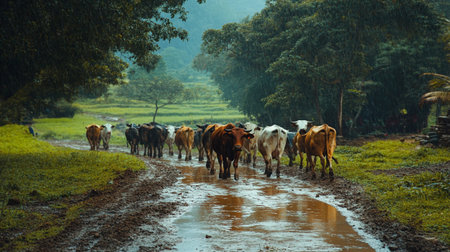 A herd of cattle walks along a rural path shrouded in fog, showcasing the beauty of a winter landscape and the tranquility of farm life.