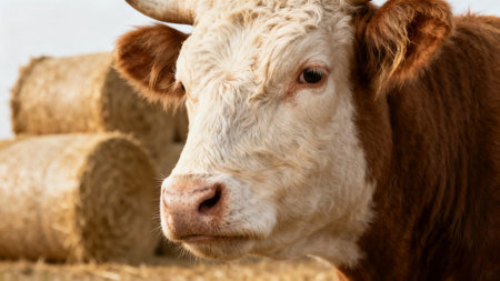Closeup of a cow with hay bales