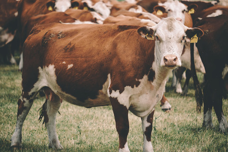 Herd of cows at summer green field .Agriculture farming rural pasture
