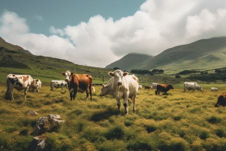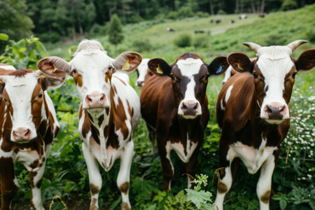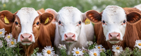 Experience the charm of countryside life with adorable cows amidst vibrant seasonal flowers This fresh take on rural scenes showcases nature's beauty, blending animals and flora harmoniously Discover this picturesque setting where cows and flowers unite in a stunning, idyllic display of rural life AI Generative