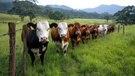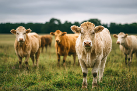 Cheerful cattle with smooth light and brown hide amble through lush pasture, their alert eyes capturing a sense of peaceful curiosity beneath a cloudy sky.