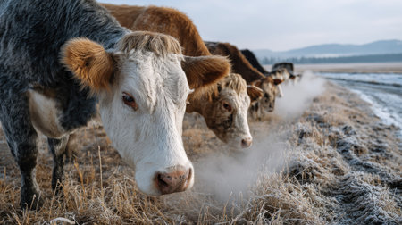 A group of cows stands in a frosty field at dawn, breathing out vapor as they enjoy the cold morning. The scenic rural landscape creates a tranquil atmosphere.