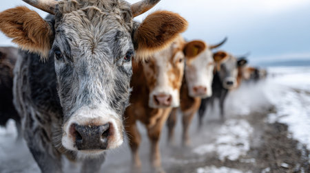 A captivating close-up of a curious cow standing in focus with a herd of cattle in the background, set against a misty, winter landscape.