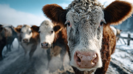 This striking image features a close-up of a curious cow in a snowy landscape, surrounded by fellow cattle. Its expressive face and warm fur capture the essence of rural life in winter.