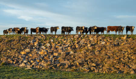 Herd of New Zealand cattle on top of a hill made of rocks.