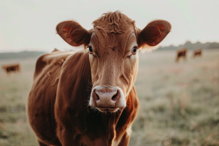 Cow portrait in golden light, grazing in pasture