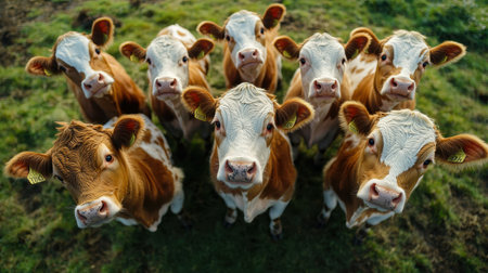 A diverse group of cows stands closely together in a vibrant green meadow. They look up with curiosity, showcasing their brown and white coats under bright sunlight.