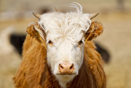 Young Chandler Herefords cow Portrait. Brown and white paint cow. Cute Orange cow with white head