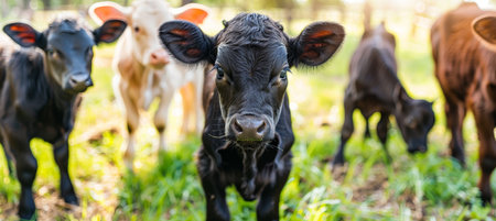 Energetic and joyful young cattle playfully grazing in a sunlit and lush green pasture