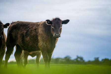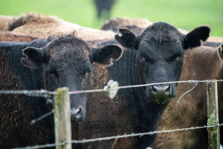 Stud Angus, wagyu, Murray grey, Dairy and beef Cows and Bulls grazing on grass and pasuture. The animals are organic and free range, being grown on an agricultural farm in Australia.