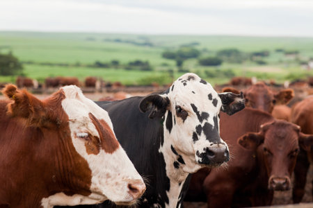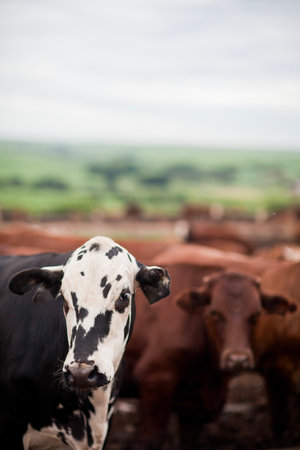 Close up portrait of curious cow among herd of cows and bulls. Dairy farm animals are grazing in paddock. Animal husbandry in the countryside.