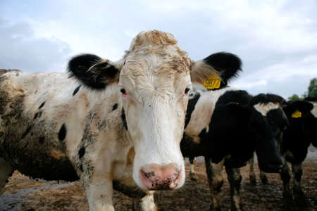 Portrait of dairy farm cow looking at camera, selective focus