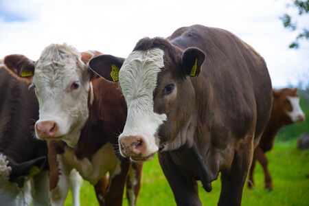Herd of young calves looking at camera. Agricultural concept