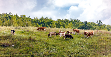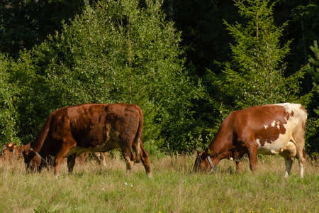 Brown and spotted cows graze in the meadow on a summer day among green forest. Horizontal photo of pets close-up