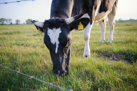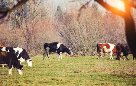 Cattle grazing on farmland pasture. Production of organic dairy products. Milk cows feeding on commercial farm grassland