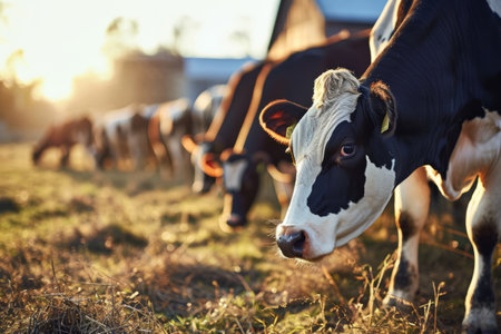 Dairy cows grazing peacefully, green meadow bathed in warm sunlight