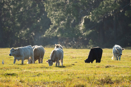 Capturing the Tranquil Moment of Cows Grazing in a Radiant Morning Meadow