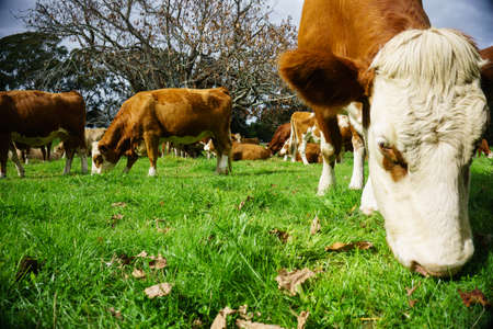 Close up of cows in a field, grazing on pasture, in Australia