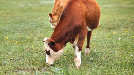 Beef cattle livestock calf eating grass in pasture on a cloudy day, with adult cow in the distance. Farm and agriculture concept.