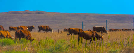 Livestock. Cows graze in a meadow. The concept of animal husbandry and rural life. Chipping of animals. A pet on an eco-farm. Agricultural industry.