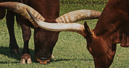 Two Grazing Cows with Impressive Horns in Open Field