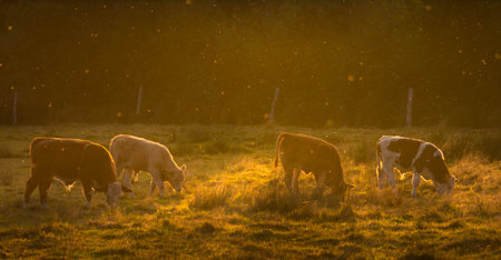 Cows Grazing in a Beautiful Meadow as the Sunrise Illuminates the Landscape