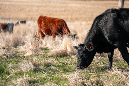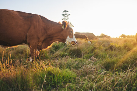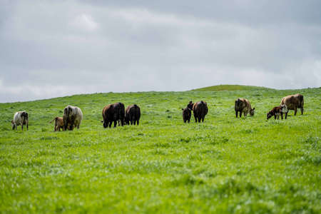 Carbon neutral cattle farming in a free range field on a farm in Australia beautiful cattle in Australia eating grass, grazing on pasture. Herd of cows free range beef regenerative raised