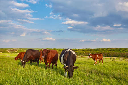 Cows graze green grass. The concept of agriculture, the cultivation of livestock. Colorful cows. steers, young calves graze on the summer juicy grass. Warm light. production of milk, beef, cheese.