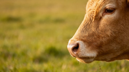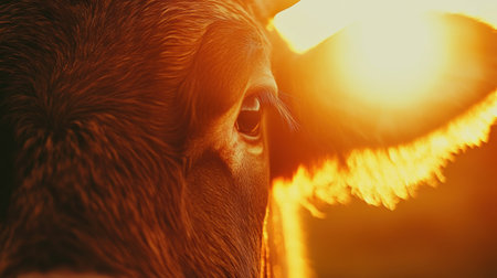 Detailed close-up of a cows face showcases warm sunlight on soft fur, emphasizing textures while a blurred farm backdrop enhances the tranquil rural setting.