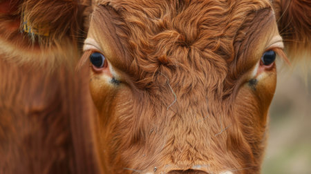 This close-up shot showcases a brown cows face, highlighting its distinctive features such as the large expressive eyes, soft fur, and prominent snout. The cows nostrils are flaring slightly, and its ears are perked up, adding to the overall character of the animal.