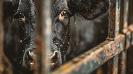 A fascinating close-up shows curious cows peering through a wooden fence in a barn, highlighting the charm and essence of farm life.