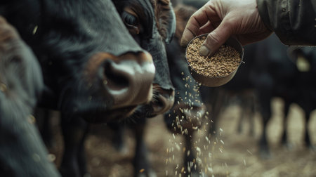 a farmer's hands feeding grain to cows inside a barn, the tactile interaction as a cow's mouth delicately takes the grain from the farmer's hand