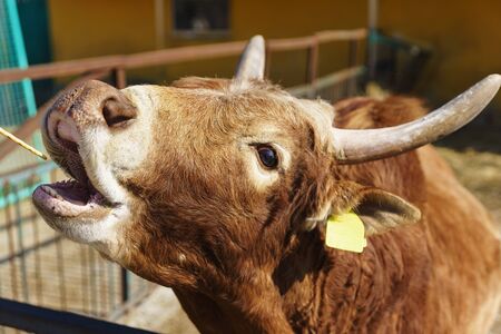 A cow with ear tags is looking directly into the camera. An ideal atmospheric scene with rustic comfort and a sweet mood