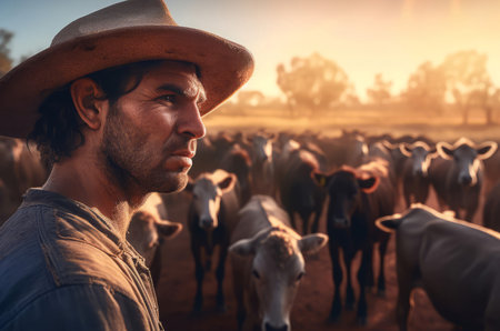 Australian man cattle. Cute face man portrait at sunset view. Generate Ai