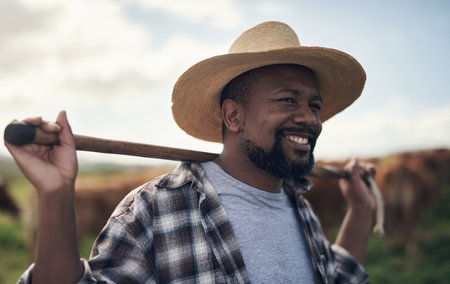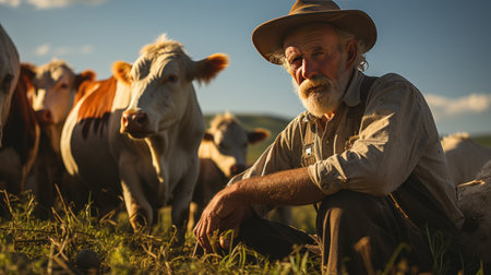 A confident farmer stands proudly in a vibrant pasture with cows. Surrounded by lush greenery, this image captures the essence of agriculture and rural life.