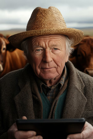 Modern Farmer, Traditional Roots An Elderly Cattle Rancher Utilizes a Tablet In the Pasture
