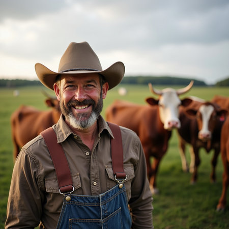 Smiling farmer in overalls and straw hat, standing in a green field with cows