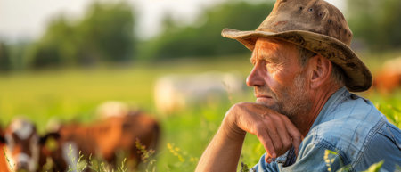 Side profile of a thoughtful rancher, surrounded by cattle and open landscape under bright blue skies.