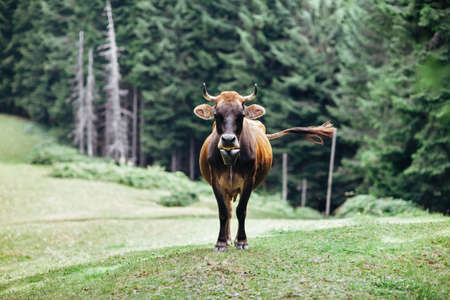 Cow grazing freely on the mountain in the fog. Cow on green pasture. Ecological livestock. Meat production concept.