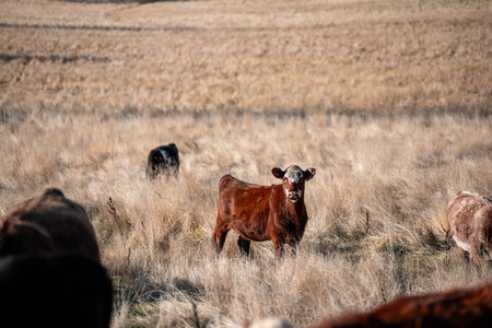 Stud Angus, wagyu, Murray grey, Dairy and beef Cows and Bulls grazing on grass and pasture in a field. The animals are organic and free range, being grown on an agricultural farm in Australia.