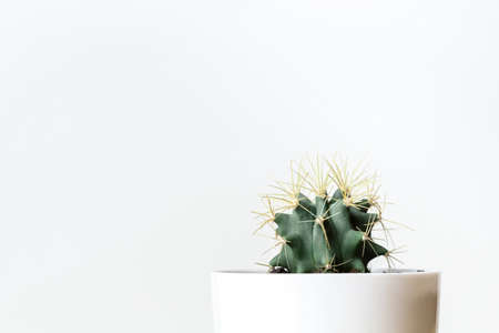 Green round cactus with long spines in a white pot on light background