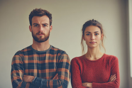 Two young adults stand side by side with arms crossed, looking serious against a neutral wall backdrop. Their expressions suggest contemplation or strength.